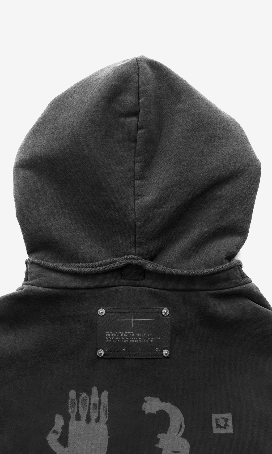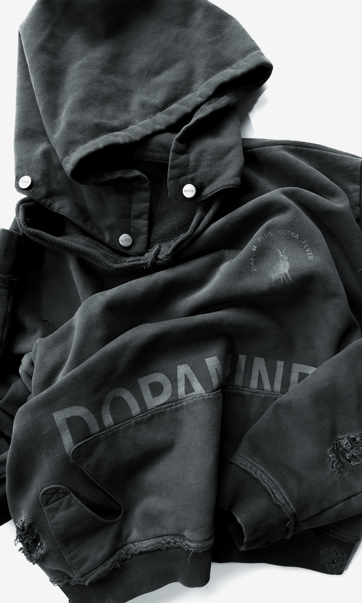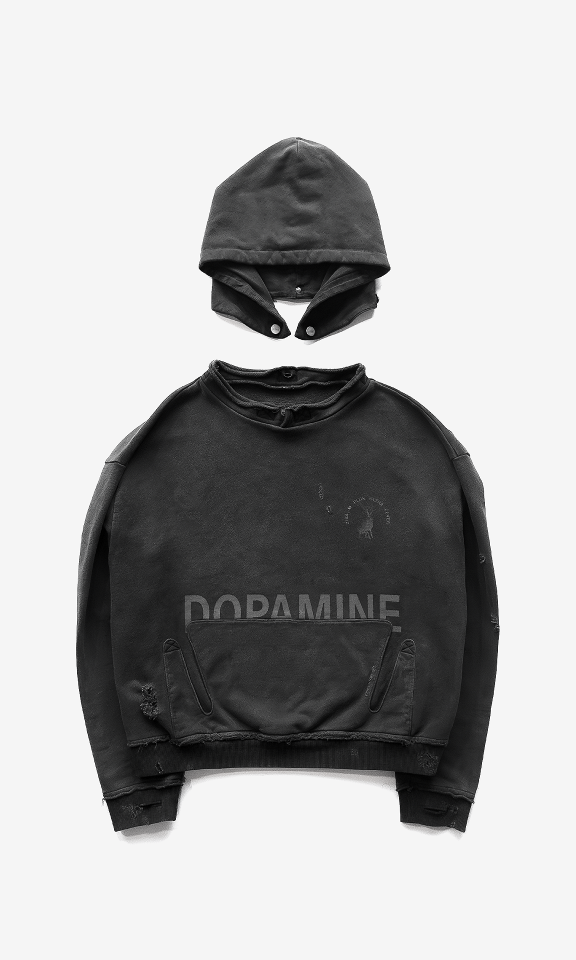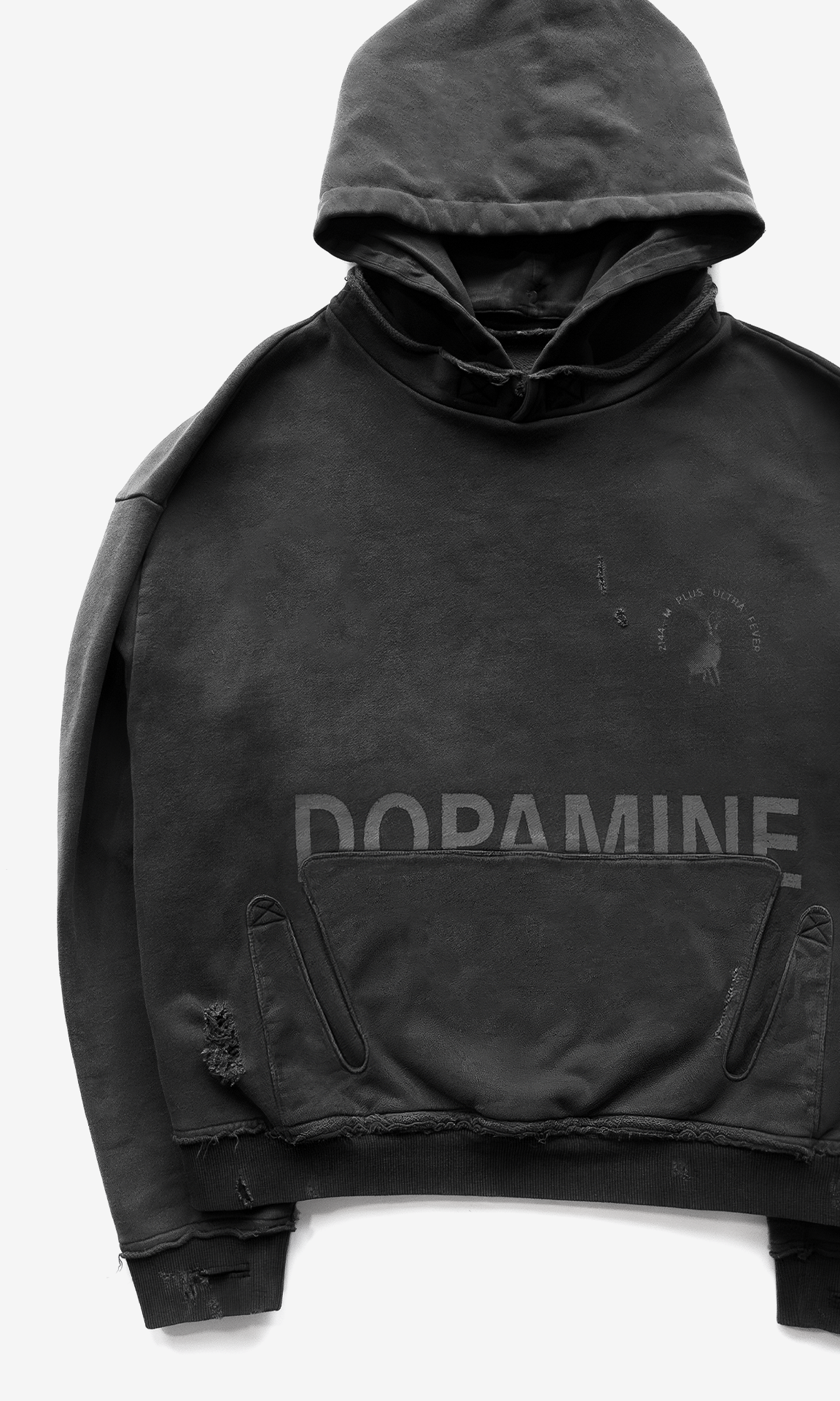 Redux DOPAMINE V2 hoodie in new Onyx black overdye pigment. A foundational piece in our history as a brand, updated with tack button removable hood system, signature "2144-M" logo metal hardware in metallic silver, and newly oversized MECH V4 front pocket. Angular/tailored silhouette rework, vintage faded finish, distressing mimics natural wear from intense physical labor, reconstructed raw edge seams at waist/cuffs. Overlapped “DOPAMINE” graphic print on front with PLUS ULTRA FEVER “Jackelope” emblem, “Future Youth Kit” graphic on back and 2144 “Disclaimer” fabric label with silver rivet hardware on outer neck (size is marked on a separate interior label).