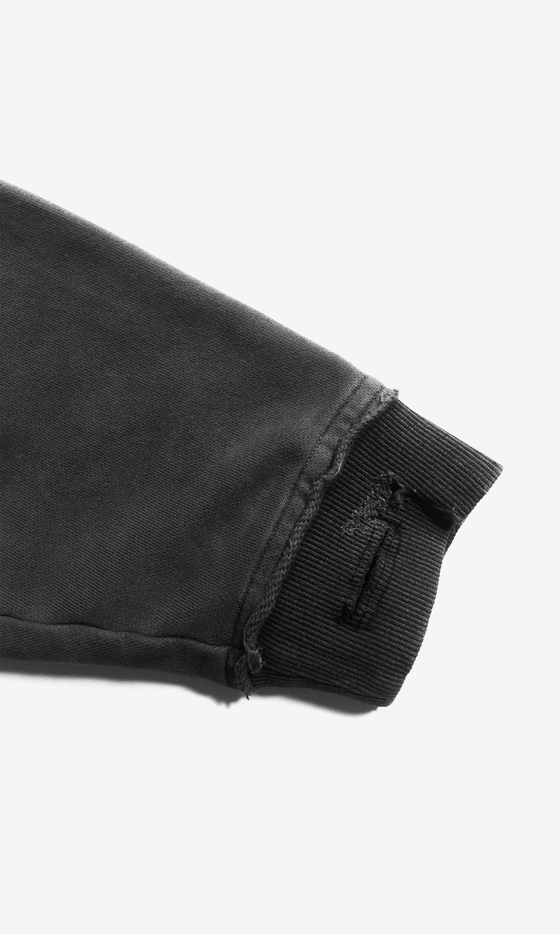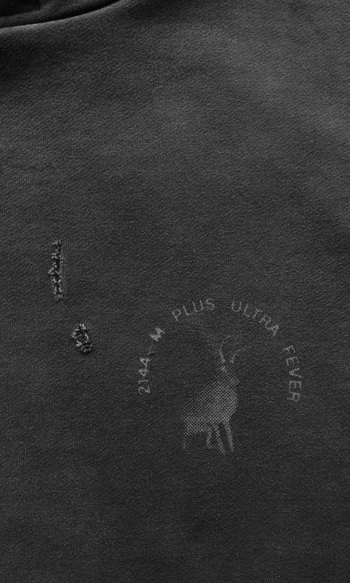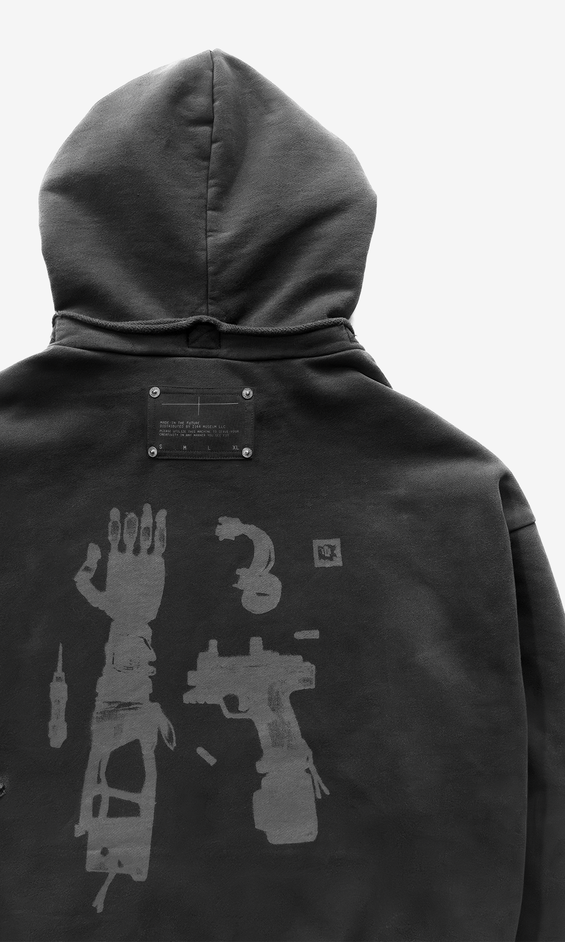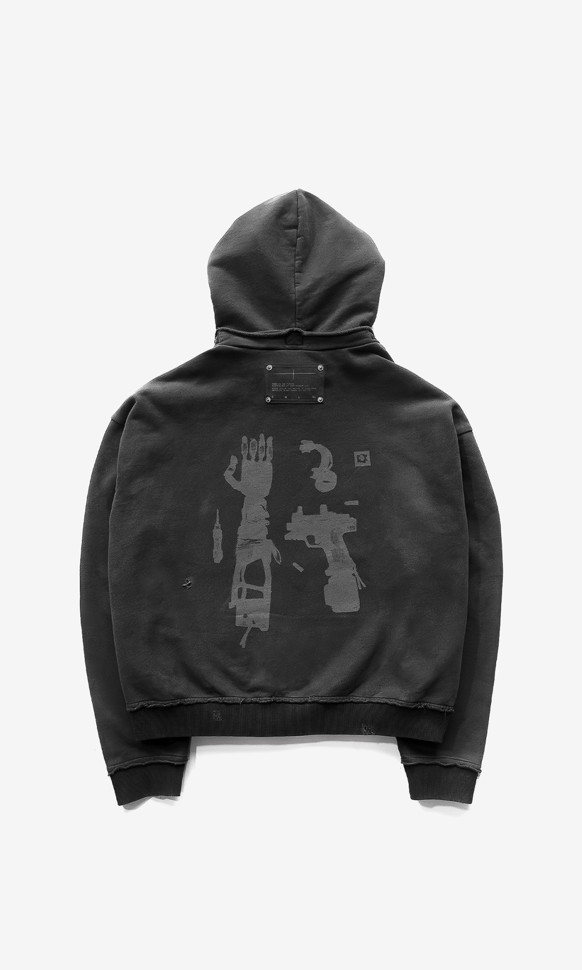 Redux DOPAMINE V2 hoodie in new Onyx black overdye pigment. A foundational piece in our history as a brand, updated with tack button removable hood system, signature "2144-M" logo metal hardware in metallic silver, and newly oversized MECH V4 front pocket. Angular/tailored silhouette rework, vintage faded finish, distressing mimics natural wear from intense physical labor, reconstructed raw edge seams at waist/cuffs. Overlapped “DOPAMINE” graphic print on front with PLUS ULTRA FEVER “Jackelope” emblem, “Future Youth Kit” graphic on back and 2144 “Disclaimer” fabric label with silver rivet hardware on outer neck (size is marked on a separate interior label).