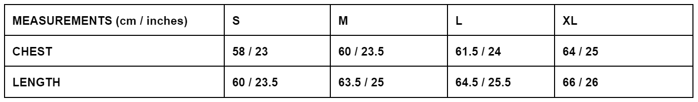 For boxy frame-fitting silhouette please order according to your normal true-to-size measurements. See size chart below.